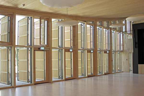 Die individuell für dieses Projekt angefertigten Sonnenschutzklappen, die der Glasfassade vorgelagert sind, können durch den Einsatz spezieller Tandem-Linearantriebe auf ca. 90° aufgefahren werden. Durch das Öffnen dahinter liegender Glasflügel welche mit 24V-RWA-Kettenantrieben ausgestattet sind, und der speziell auf diese Konstruktionskombination abgestimmten Steuerung, wird die Entrauchung sowie eine bestmögliche Be- und Entlüftung sicher gestellt.