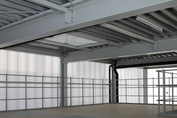 Diese Fassade eignet sich für ein innovatives Belichtungskonzept. Hier dient fast die gesamte Gebäudehülle zur Belichtung. Über 409 m2 Wandverglasung durch Polycarbonat-Platten sorgen für einen hellen Arbeitsplatz.